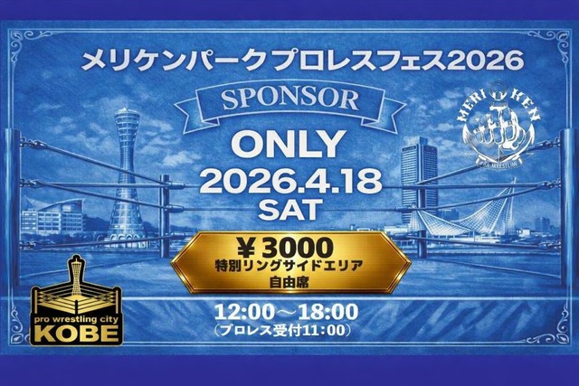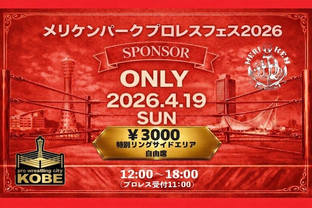 メリケンパークプロレスフェスは無料観戦で開催するため、イベントの運営をご協賛でまかなっております。 ぜひともご協力、よろしくお願いいたします!! 【メリケンパークプロレスフェス2026】 4月18日(土)12:00〜18:00 4月19日(日)12:00〜18:00 ---------------------------------------------- スポンサーチケット ◆1DAYリングサイド席 ¥3,000 ◆2DAYS通し券リングサイド席 ¥5,000 ◆2DAYS通し券超VIP席(最前列) ¥10,000 特典グッズ付き ---------------------------------------------- ※スポンサーチケットの事前発送はございません。 当日、会場の受付にお越しいただき、チケットをお渡しいたします。 ※BASEでのお申込・お支払い完了画面をご提示ください。 ※出場選手がケガ・その他の理由により、欠場・変更となる場合がございます。 ※なお、ご返金の対応はいたしかねますので、ご了承くださいませ。